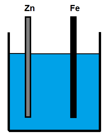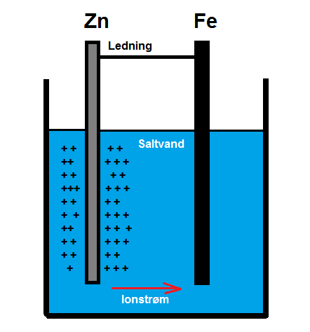 Hvis vi neddypper en zinkstav og en jernstav i en spand med saltvand, så sker der blot en almindelig tæring af begge stænger. Altså zinken vil gradvist nedbrydes og det vil jernet også. Det vil ske med en hastighed, som om hver stav var placeret i hver sin spand, og altså ikke "alarmerende" hurtigt.