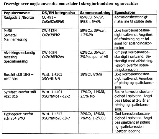 Nedenfor vises et skema over legeringer og deres anvendelighed som materiale til at lave søventiler af.